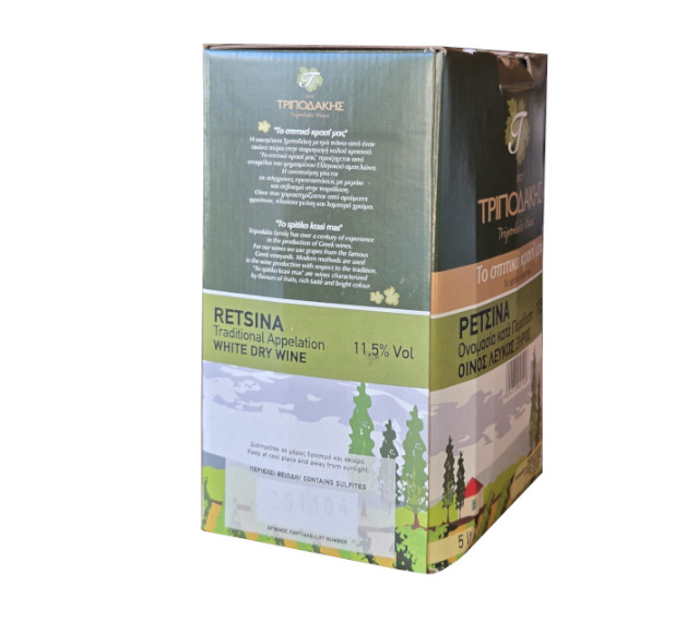 Retsina białe wino ze szczepów Roditis – Savvatiano. Zrównoważony smak ze świeżym aromatem żywicy i żółtych owoców. Serwowac w temp. 18 °C do pikantne dan.